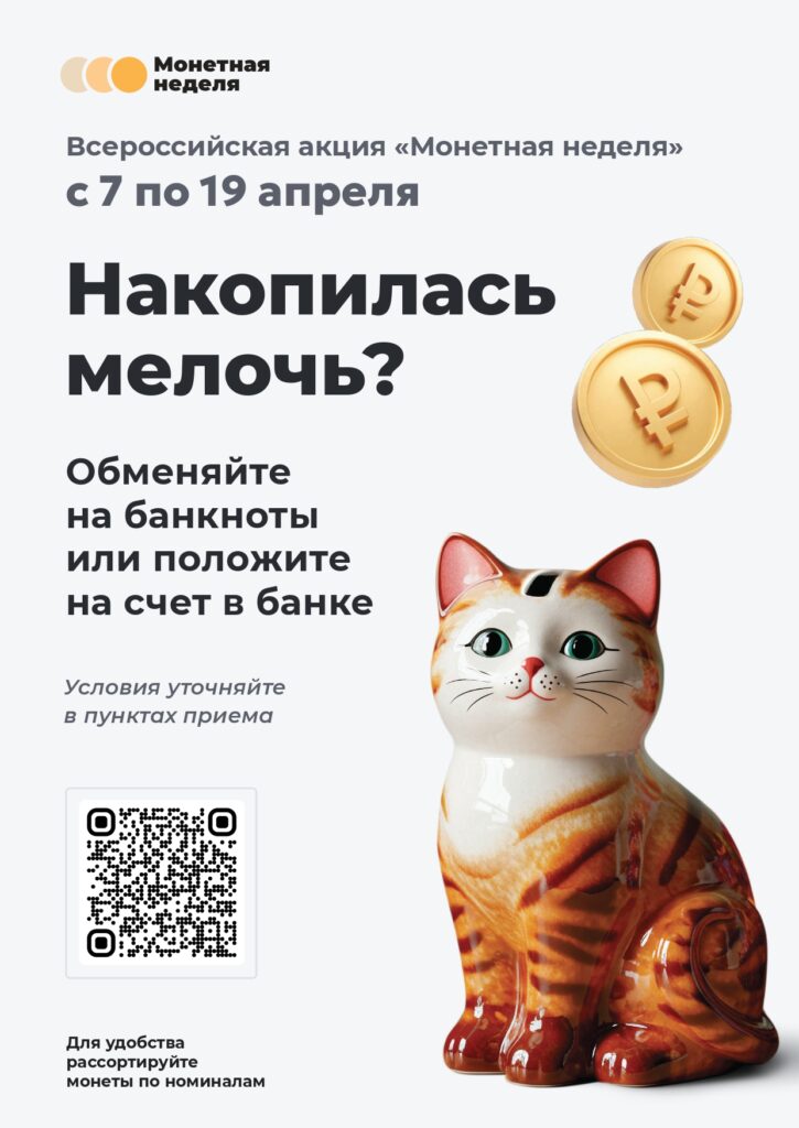 По всей стране при поддержке Банка России проходит акция «Монетная неделя». В Тамбовской области к ней присоединились 41 банковское отделение и 262 точки сетевых магазинов. В кассах банков можно будет обменять мелочь на бумажные деньги и при желании зачислить сданную сумму на счет, а в магазинах — поменять монеты на банкноты.